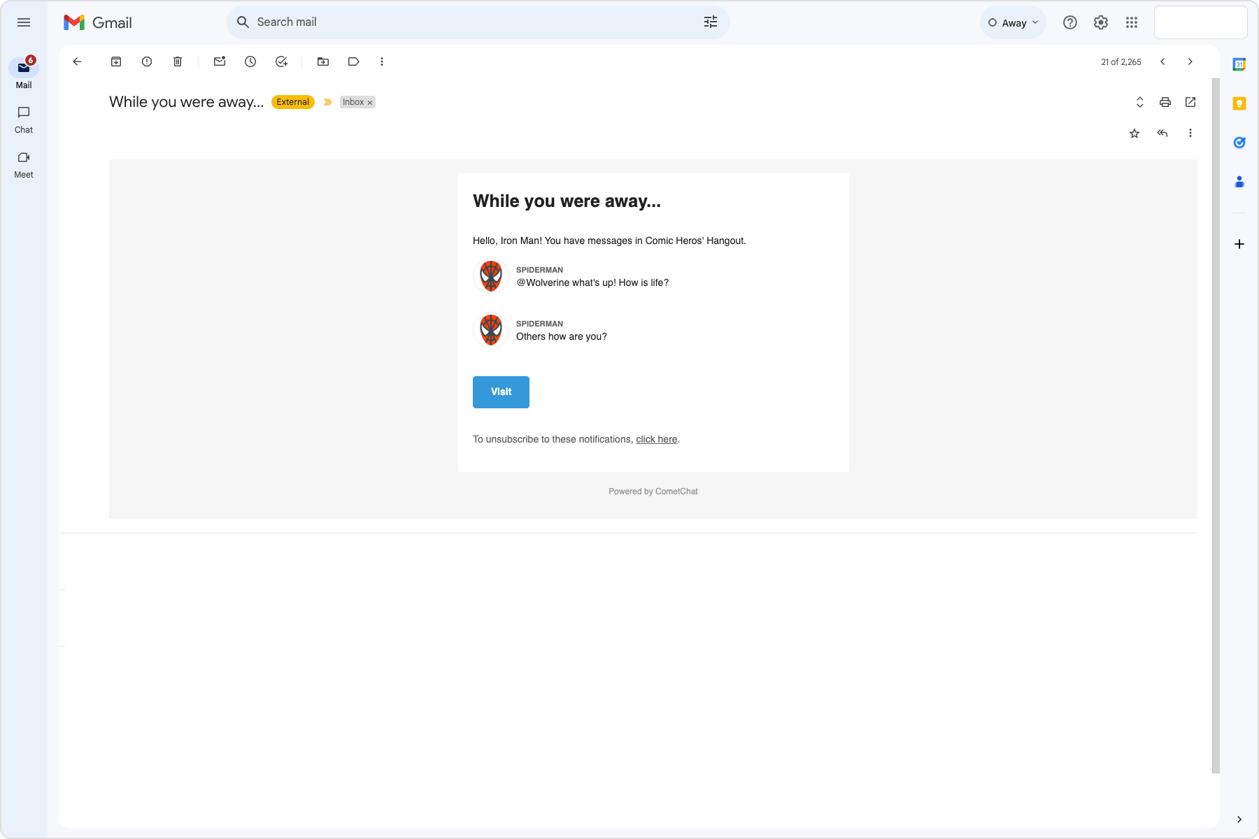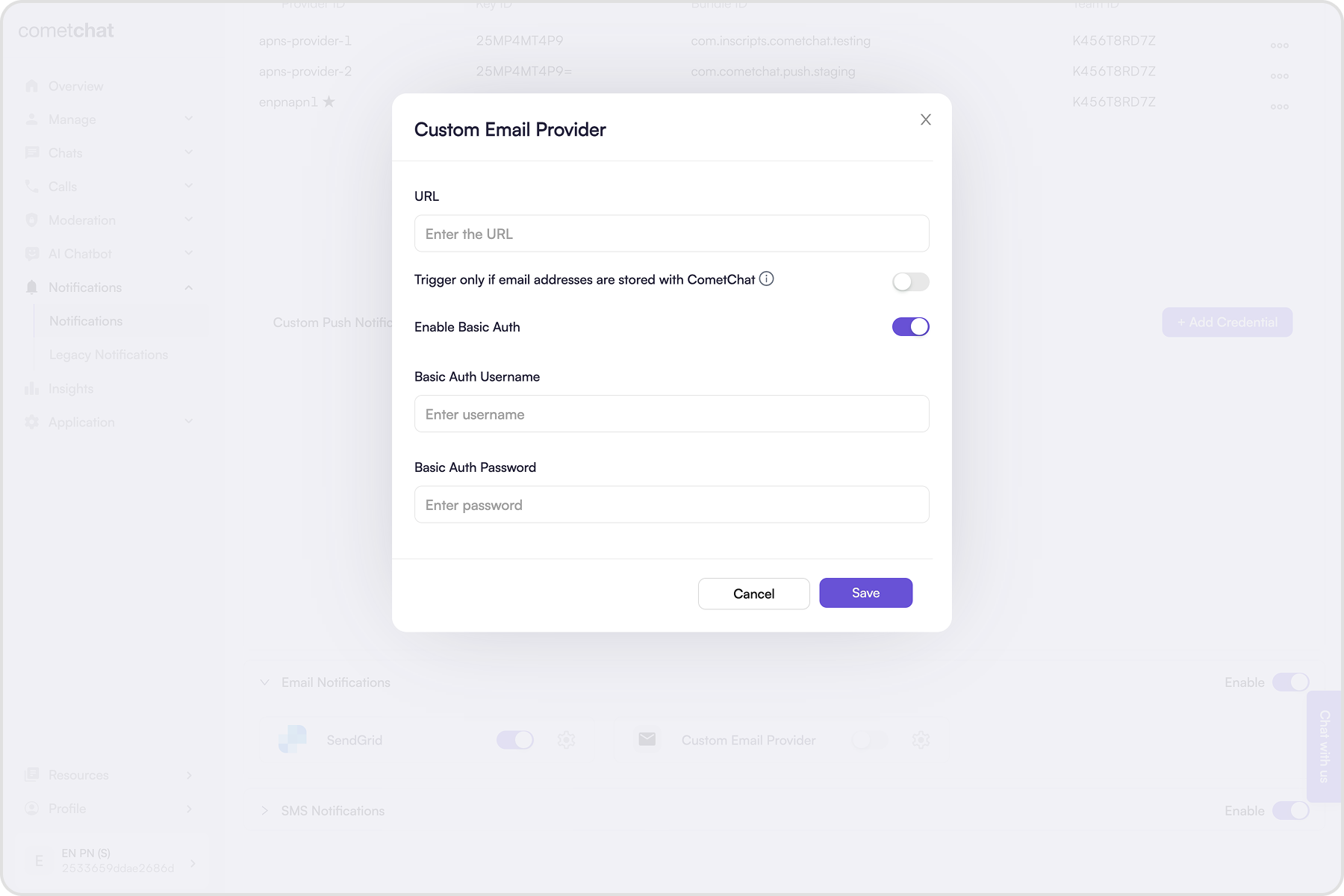 - Enabling the “Trigger only if email address is stored with CometChat” setting requires users’ email addresses to be stored with CometChat using the Update Contact details API. When enabled, the webhook is triggered only for those users. If this setting is disabled, the webhook triggers regardless of whether users’ email addresses are stored with CometChat.