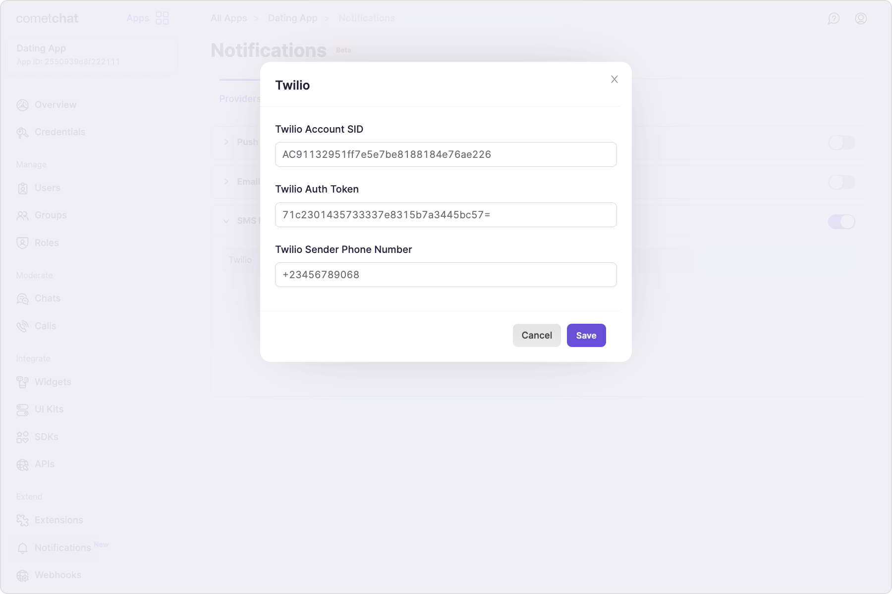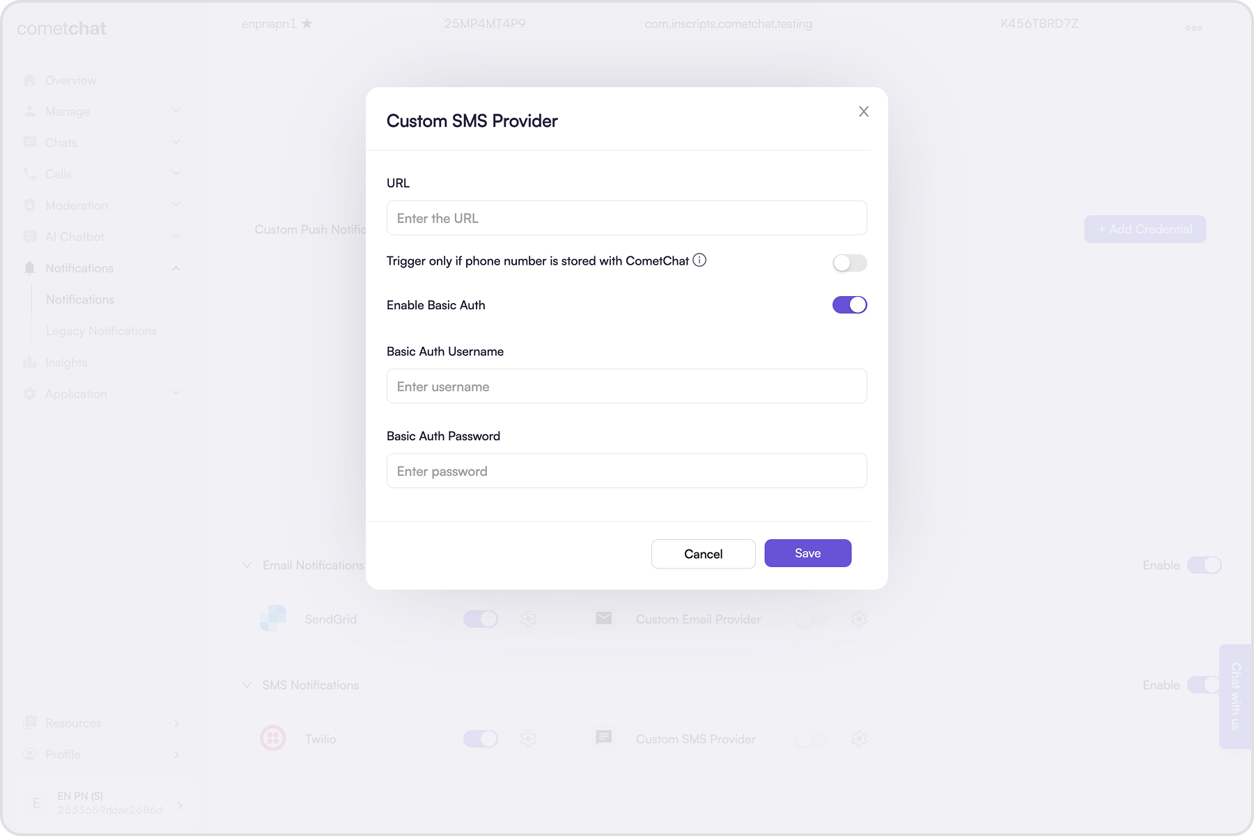 - Enabling the “Trigger only if phone number is stored with CometChat” setting requires users’ phone numbers to be stored with CometChat using the Update Contact details API. When enabled, the webhook is triggered only for those users. If this setting is disabled, the webhook triggers regardless of whether users’ phone numbers are stored with CometChat.