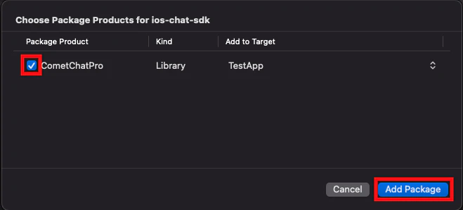 - CometChatPro must be checked in the Package Product column and click on Add Package. This will add Package Dependencies menu in Xcode.