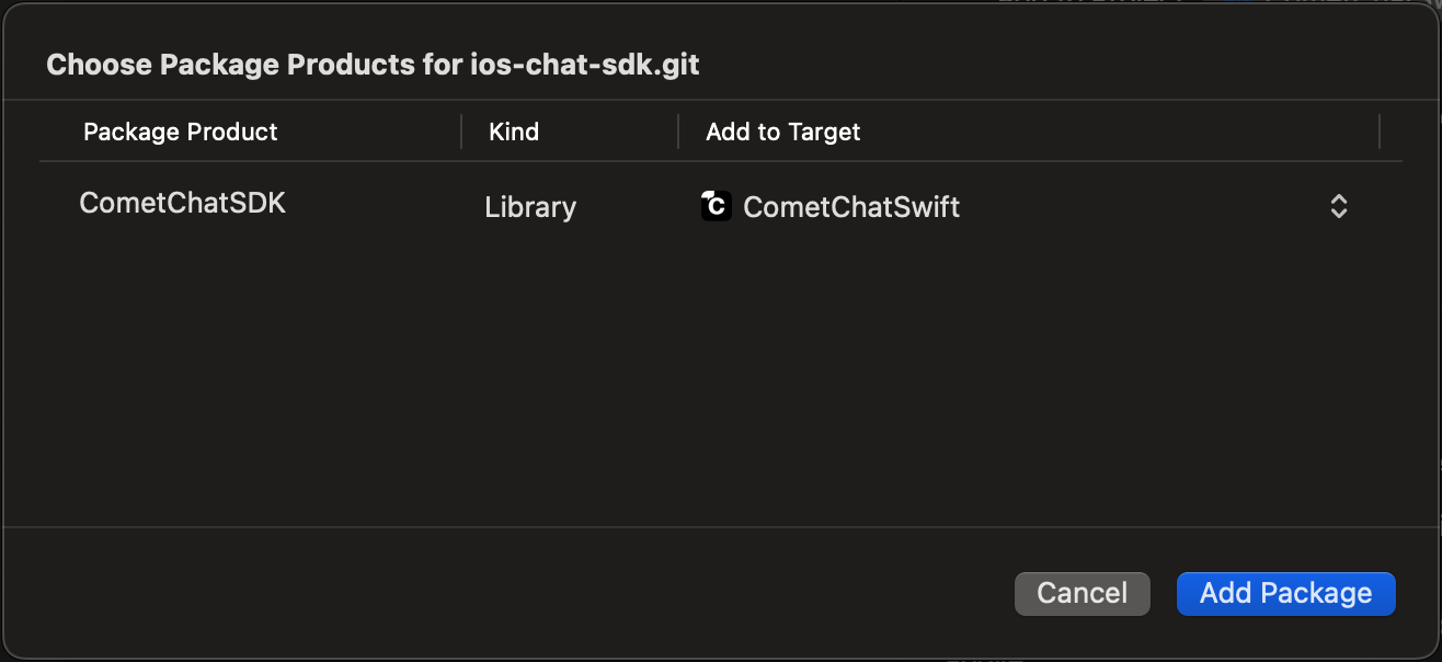 CometChatSDKmust be checked in the Package Product column and click on the Add Package button. This will add Package Dependencies menu in Xcode.