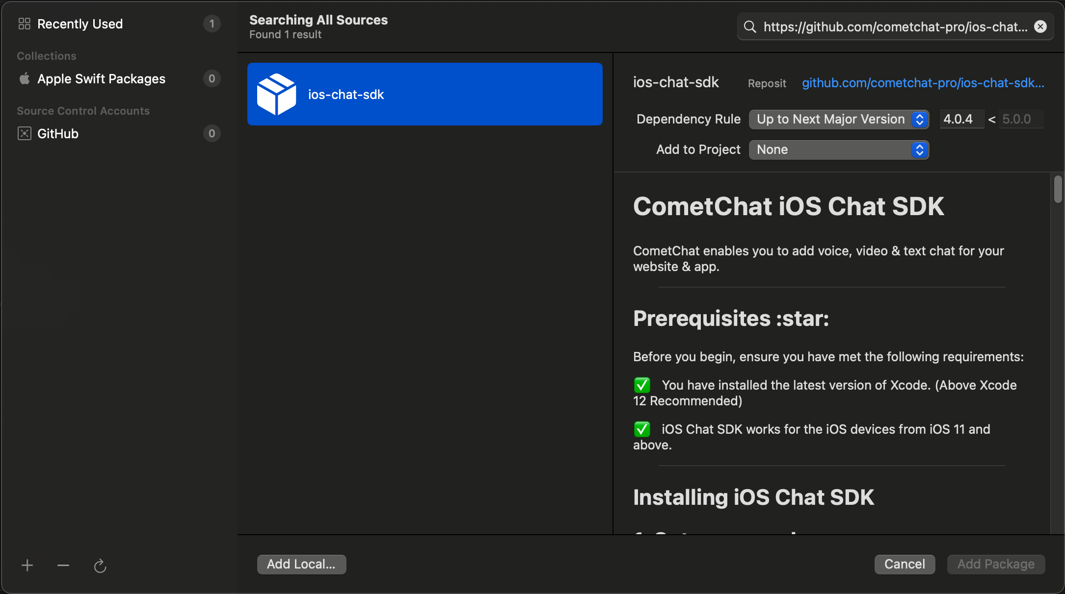 https://github.com/cometchat/chat-sdk-ios.gitand set dependency rule toUp to Next Major Versionand set version as4.0.62. Then click on the Add Package button.