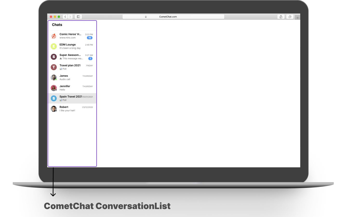 TheCometChatConversationListWithMessages is a component with a list of recent conversations. The component has all the necessary listeners and methods required to display the recent conversation list and shows the set of the messages/chats of the selected recent conversation
